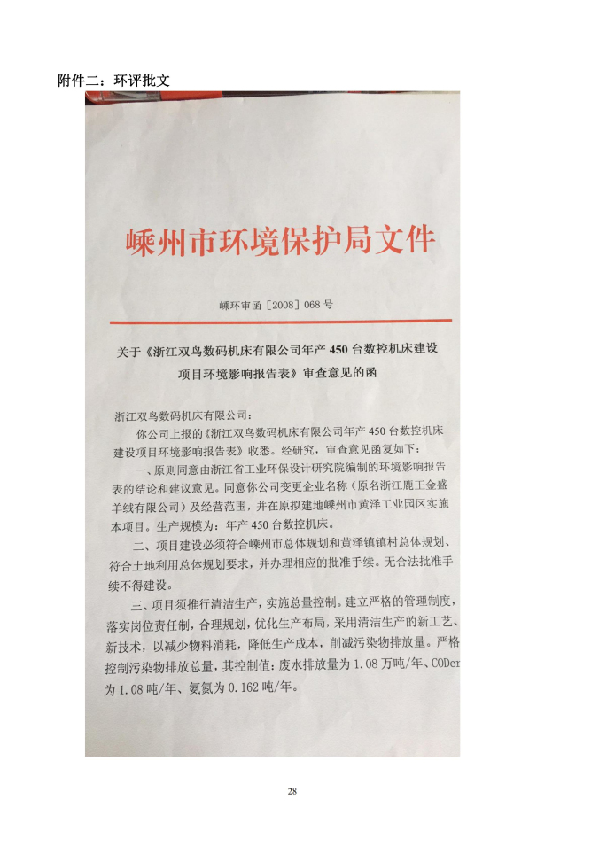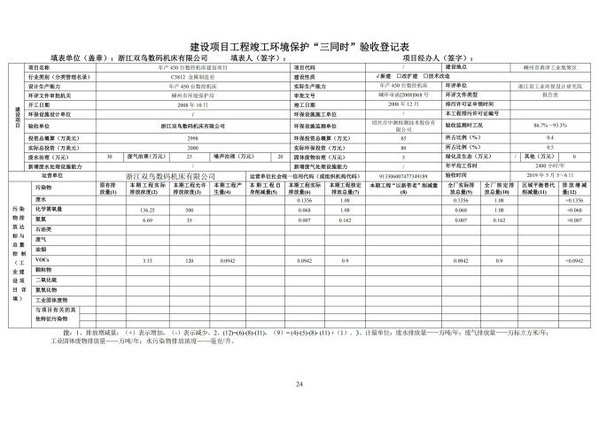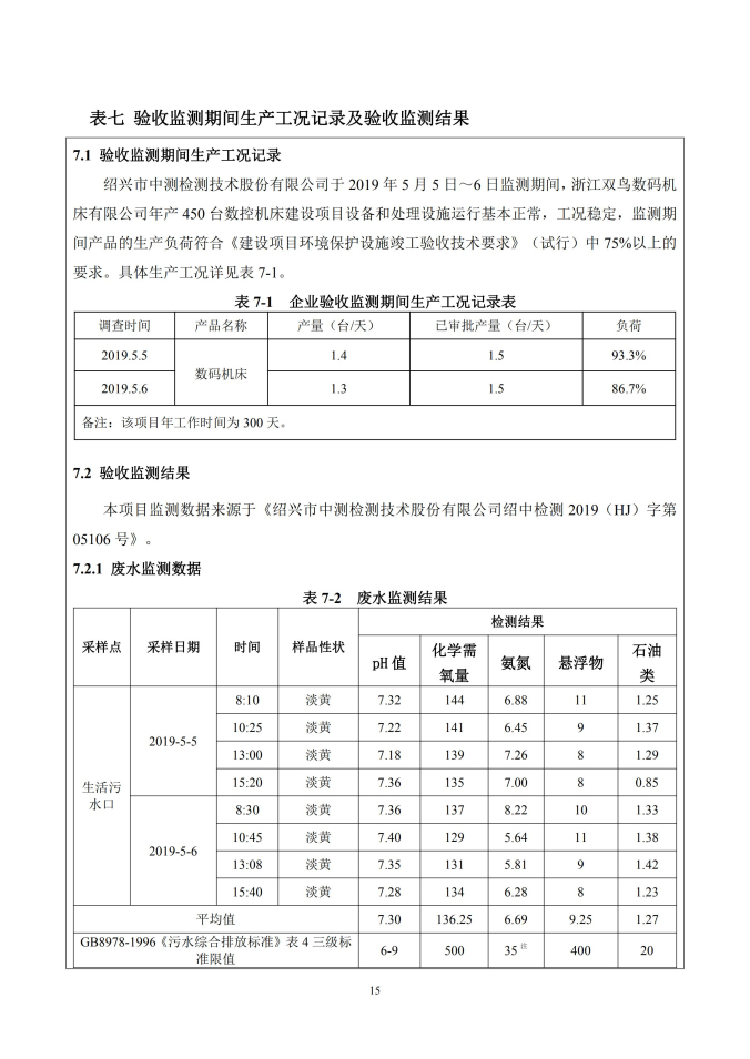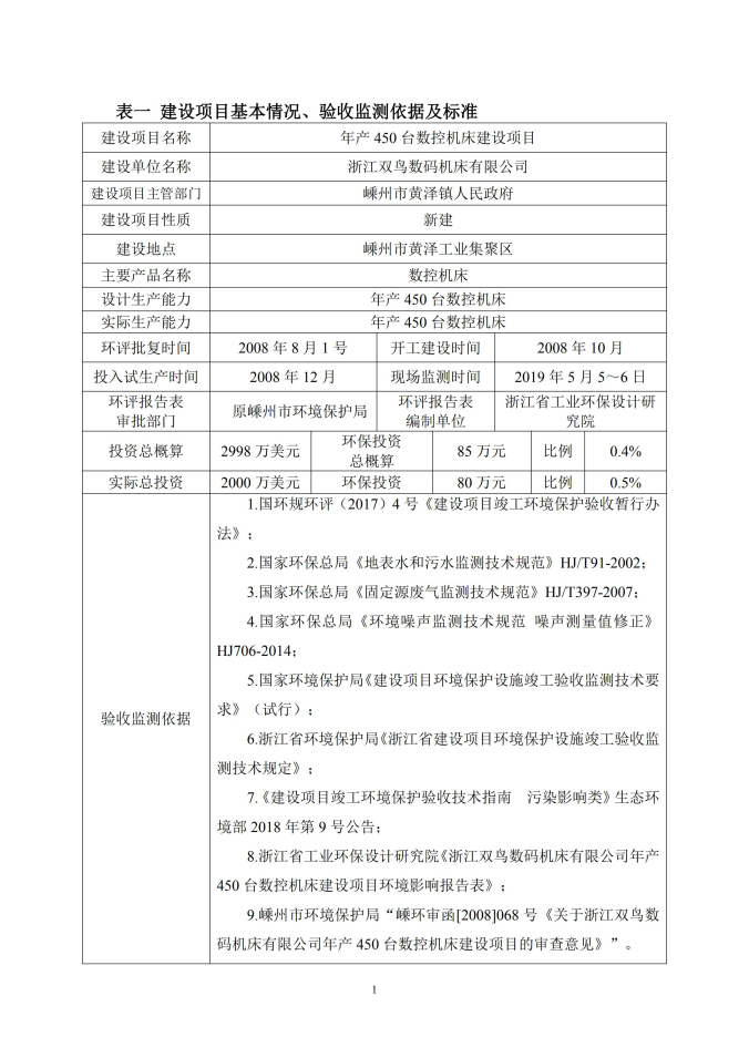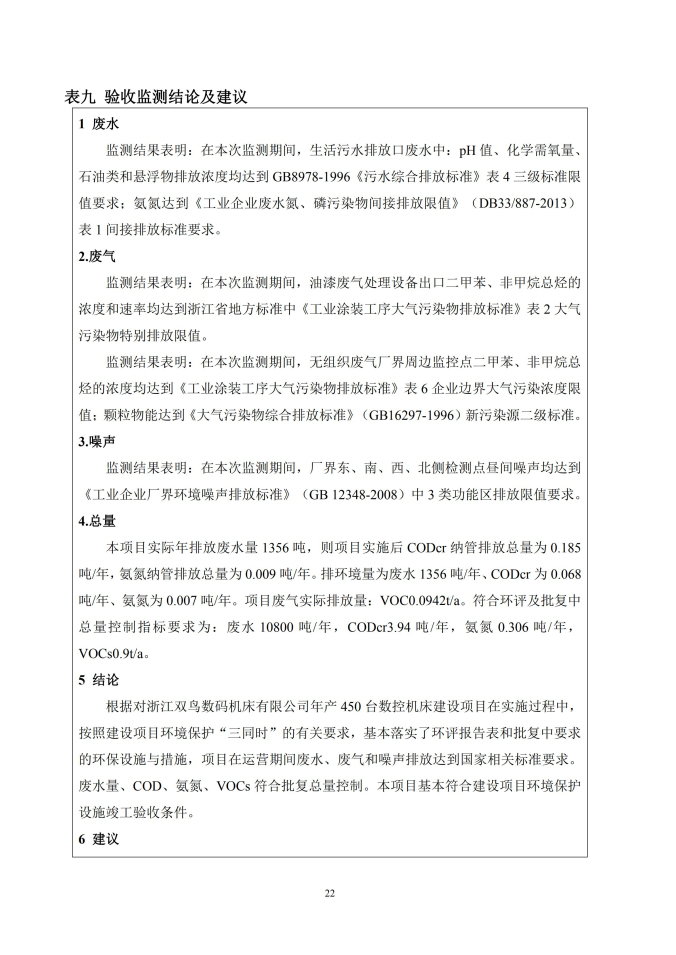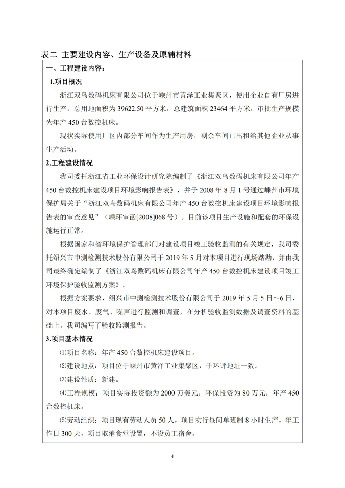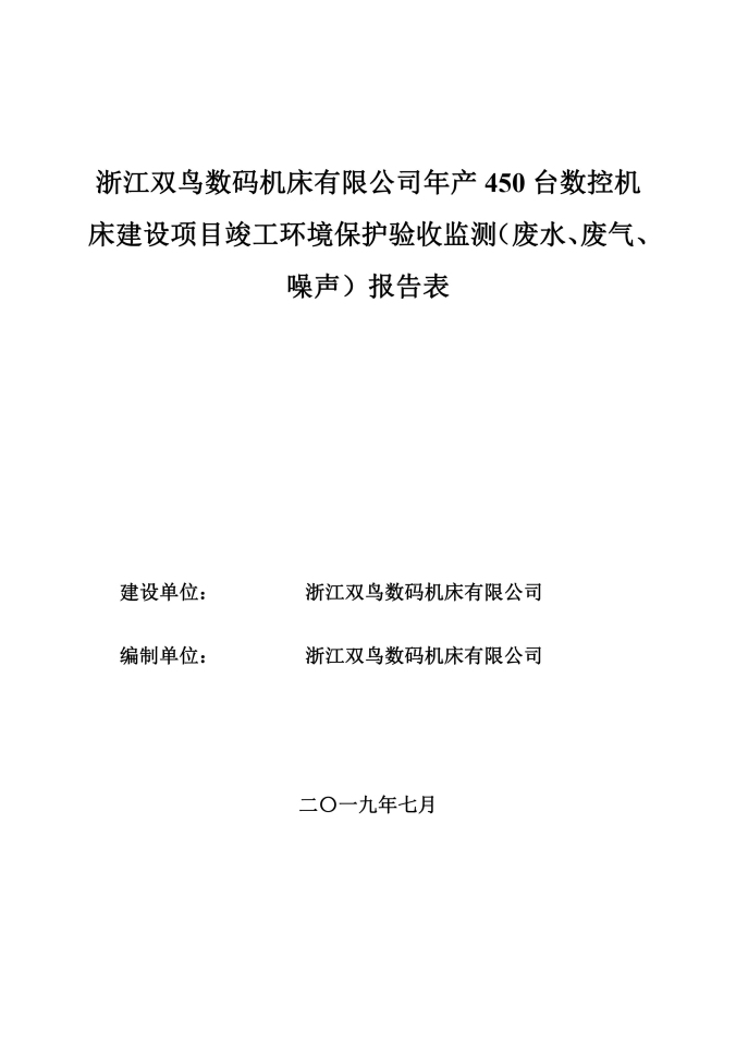 浙江雙鳥數碼機床有限公司年產 450 臺數控機 床建設項目竣工環境保護驗收監測(廢水、廢氣、 噪聲)報告表
